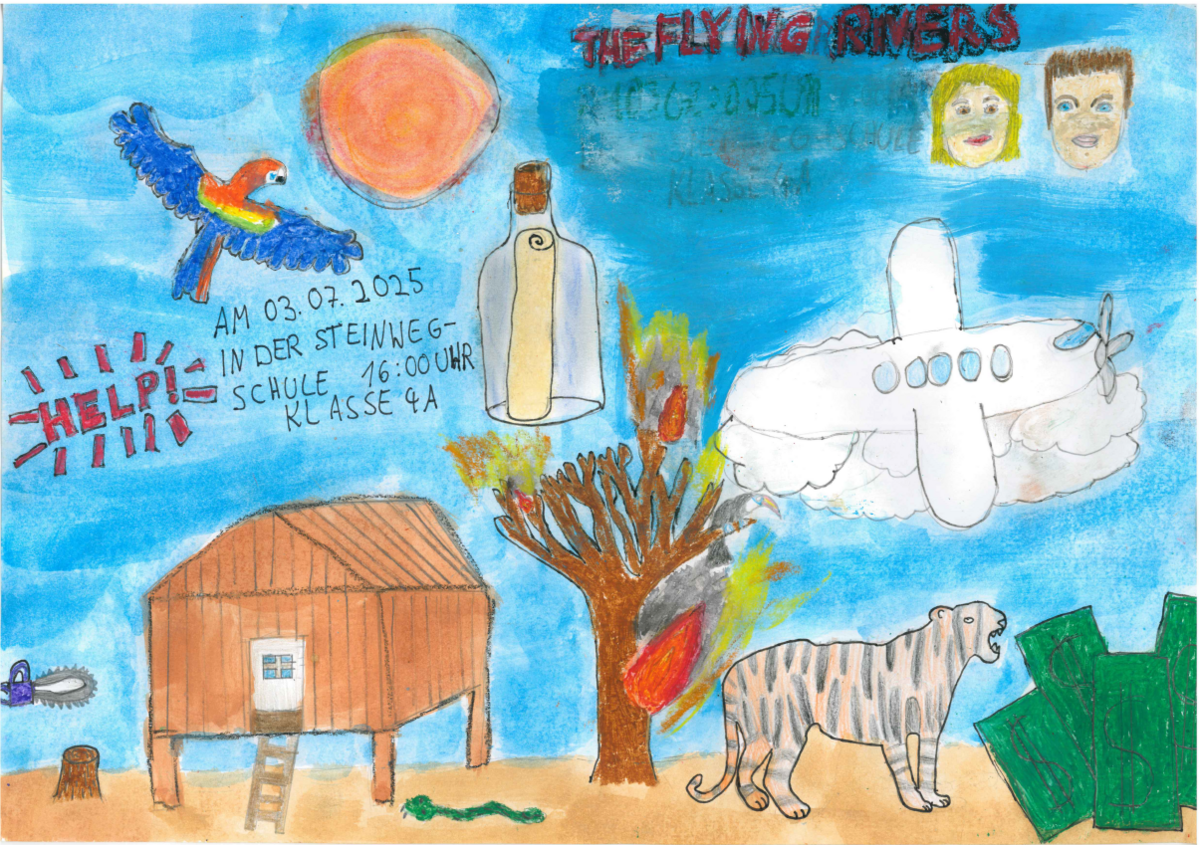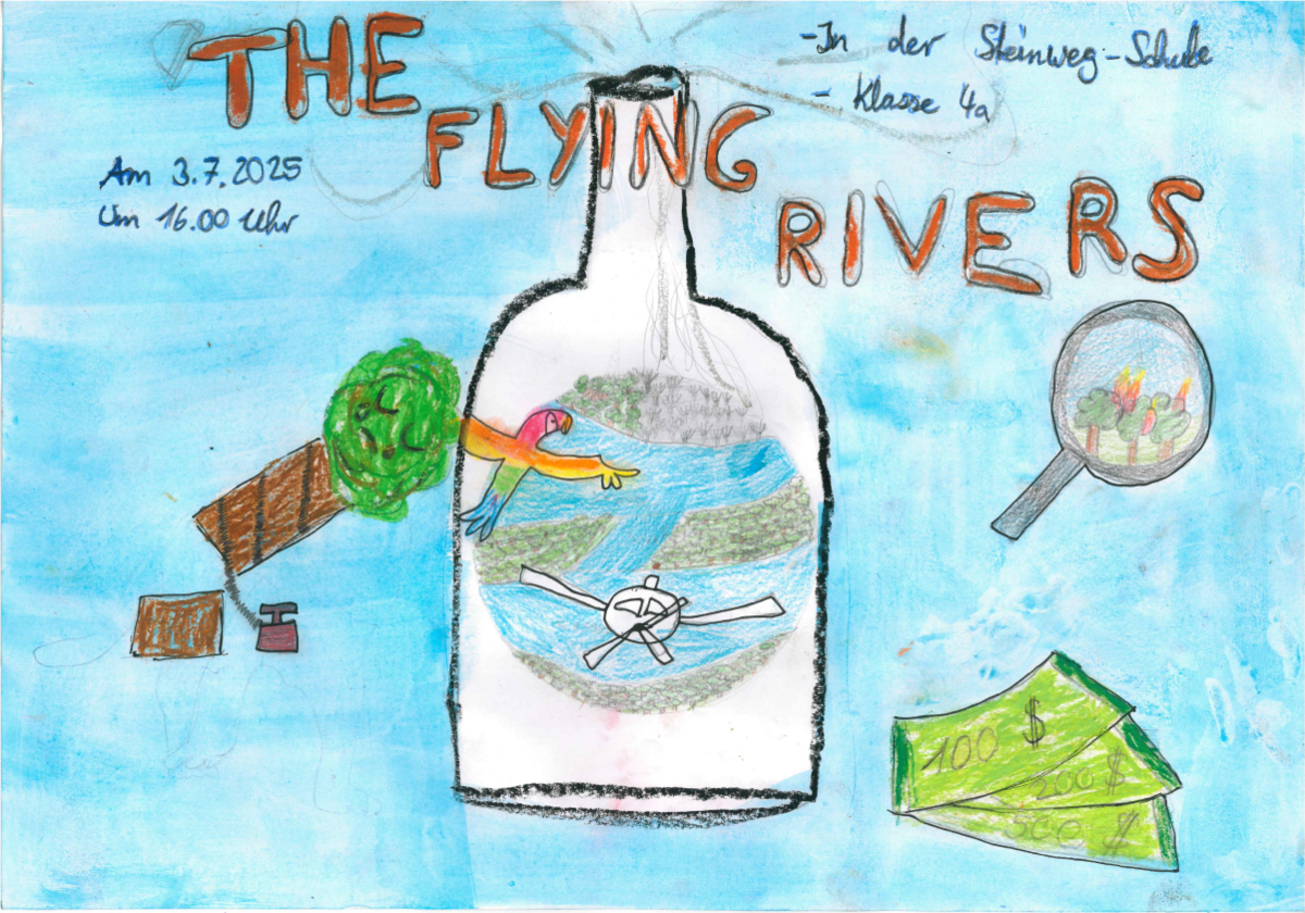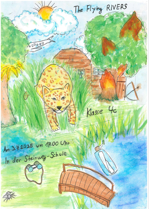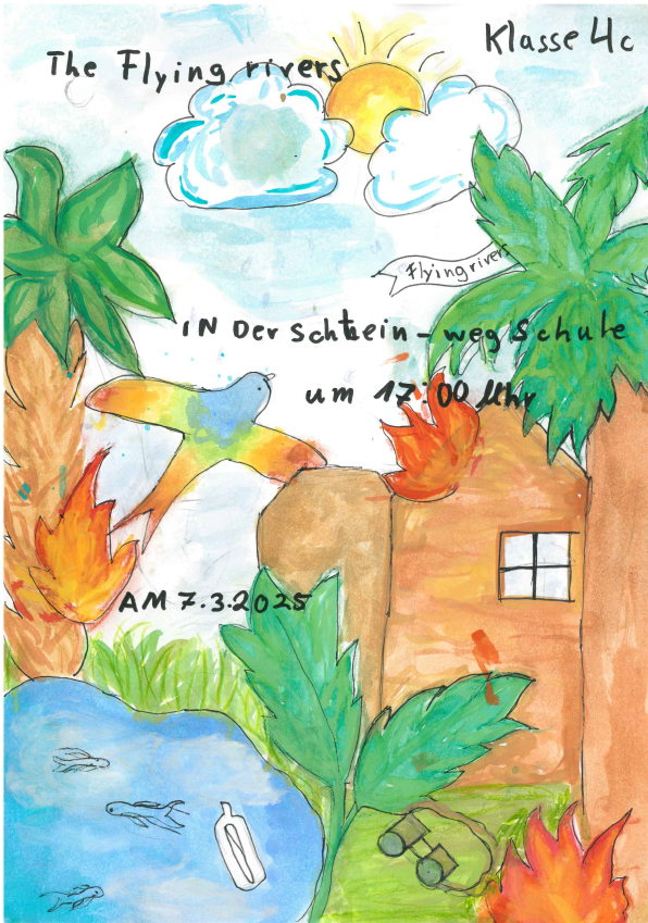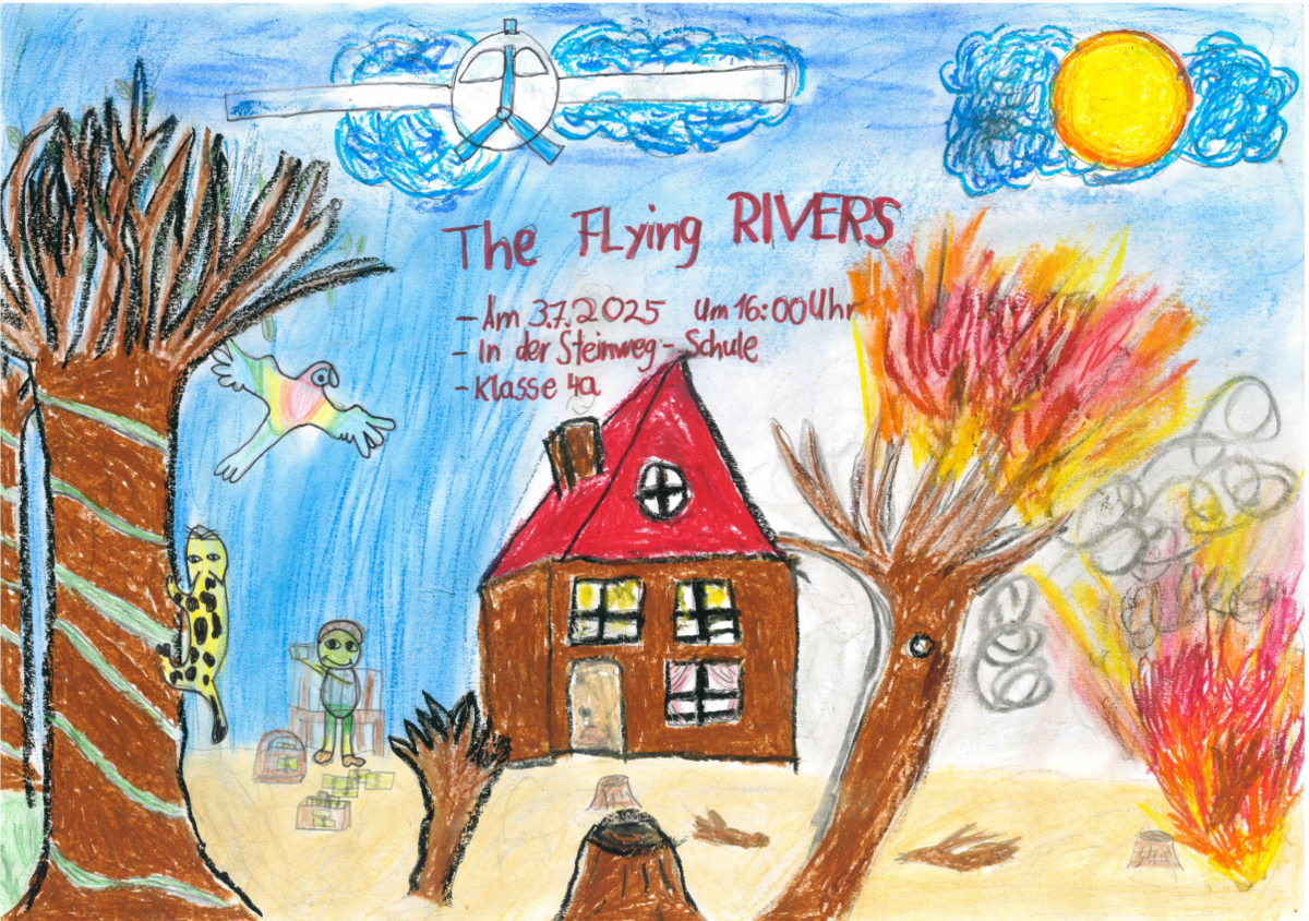 Am Freitag, den 18. Juli 2025, wurde es still in der Aula – dann laut, dann lebendig, dann nachdenklich: Die Klassen 4a und 4c präsentierten ihr selbst entwickeltes Theaterstück „The Flying Rivers“, das im Rahmen des Theaterprojekts der 4. Klassen im Schuljahr 2024/2025 entstanden ist. Und das Ergebnis war ein voller Erfolg!