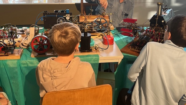 Ein besonderes Highlight bildete die Station rund um die Dampfmaschine. Der Dozent begeisterte die Kinder so sehr, dass der Funke sofort übersprang. Dampfpfiffe erklangen, und sogar eine kleine Spieluhr, angetrieben durch Dampf, erfüllte den Raum mit „Happy Birthday“.